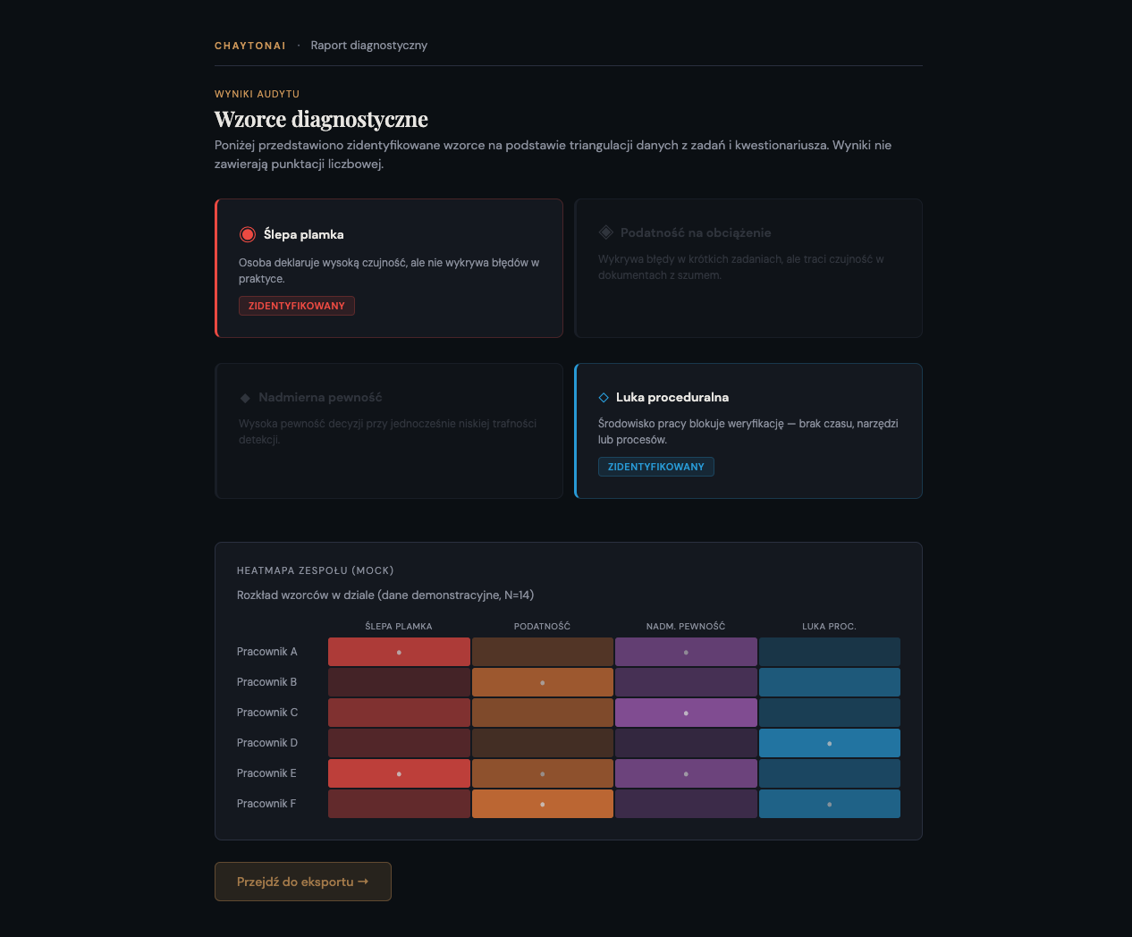 Nie ocenę pracownika — mapę ryzyka dla organizacji: które obszary, które typy danych, które warunki generują błędy. Gotowy do dostarczenia klientowi końcowemu.